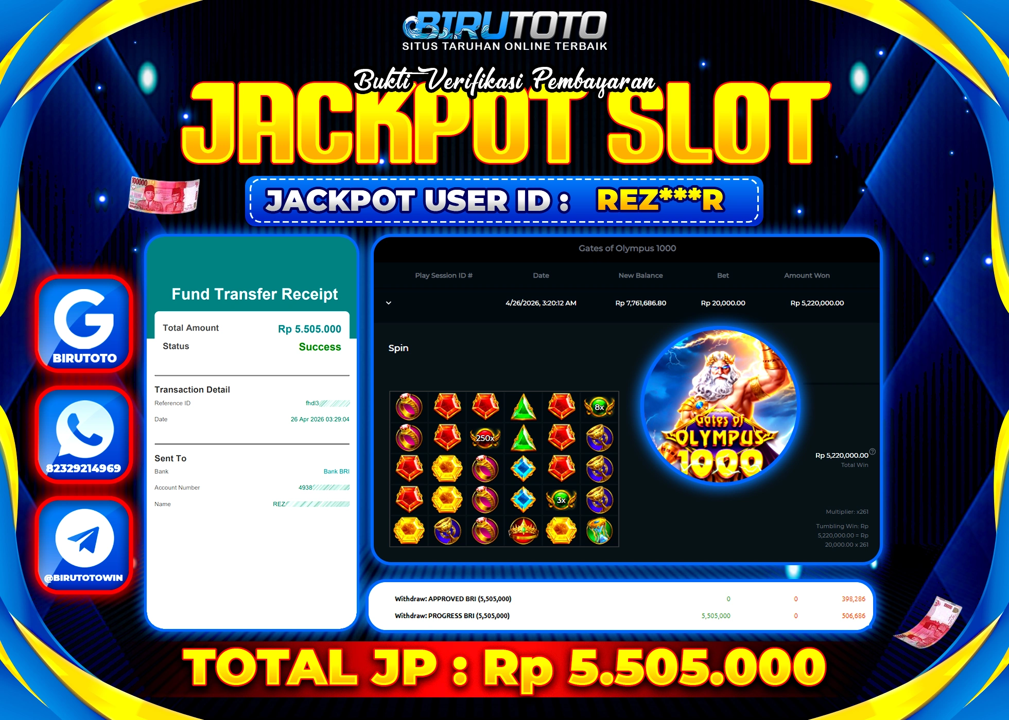 Selamat Kepada Member BIRUTOTO REZ***R Telah Jackpot Di SLOT GATES OF OLYMPUS 1000