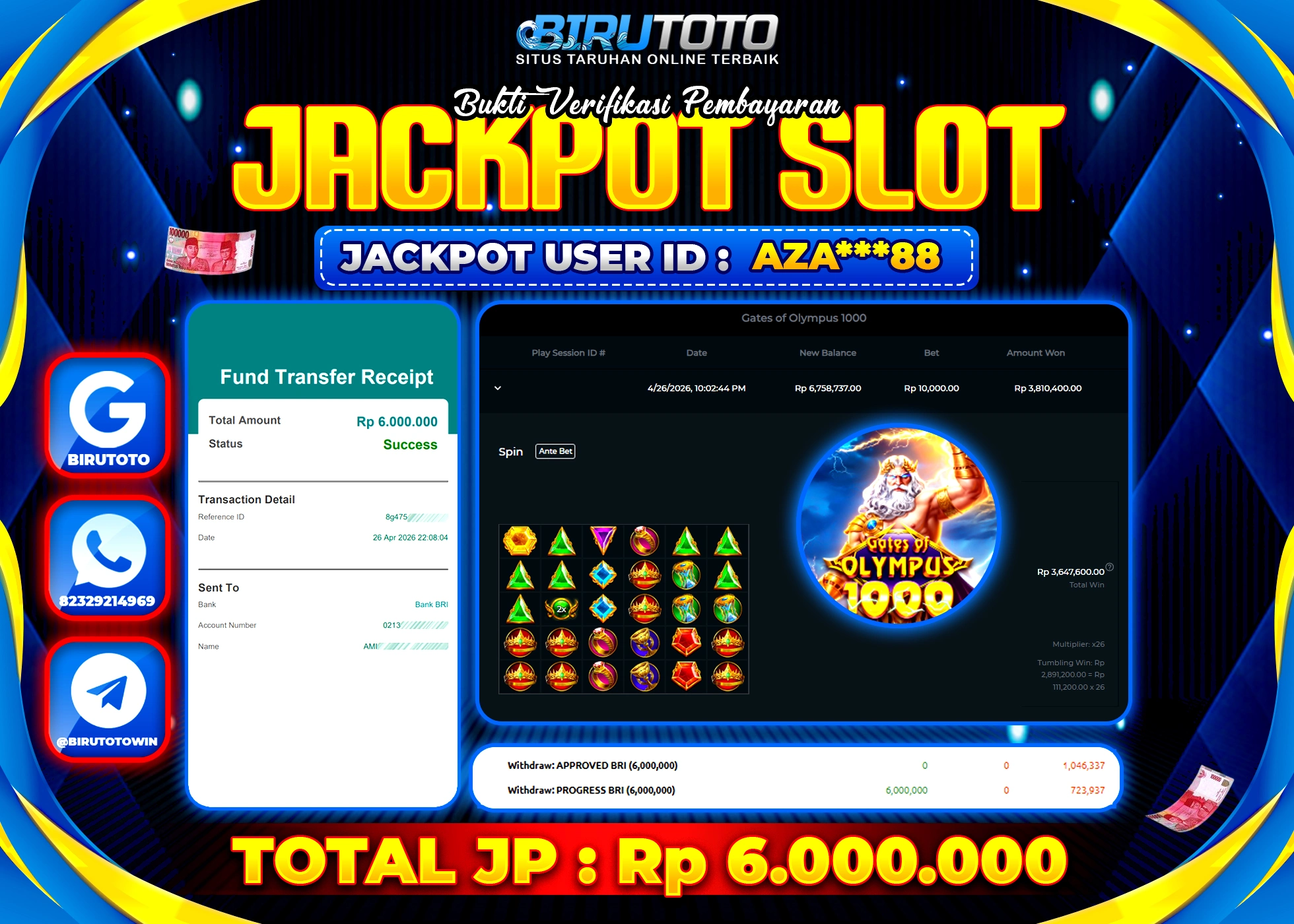 BIRUTOTO JACKPOT SLOT GATES OF OLYMPUS 1000 Rp.6.000.000 LUNAS