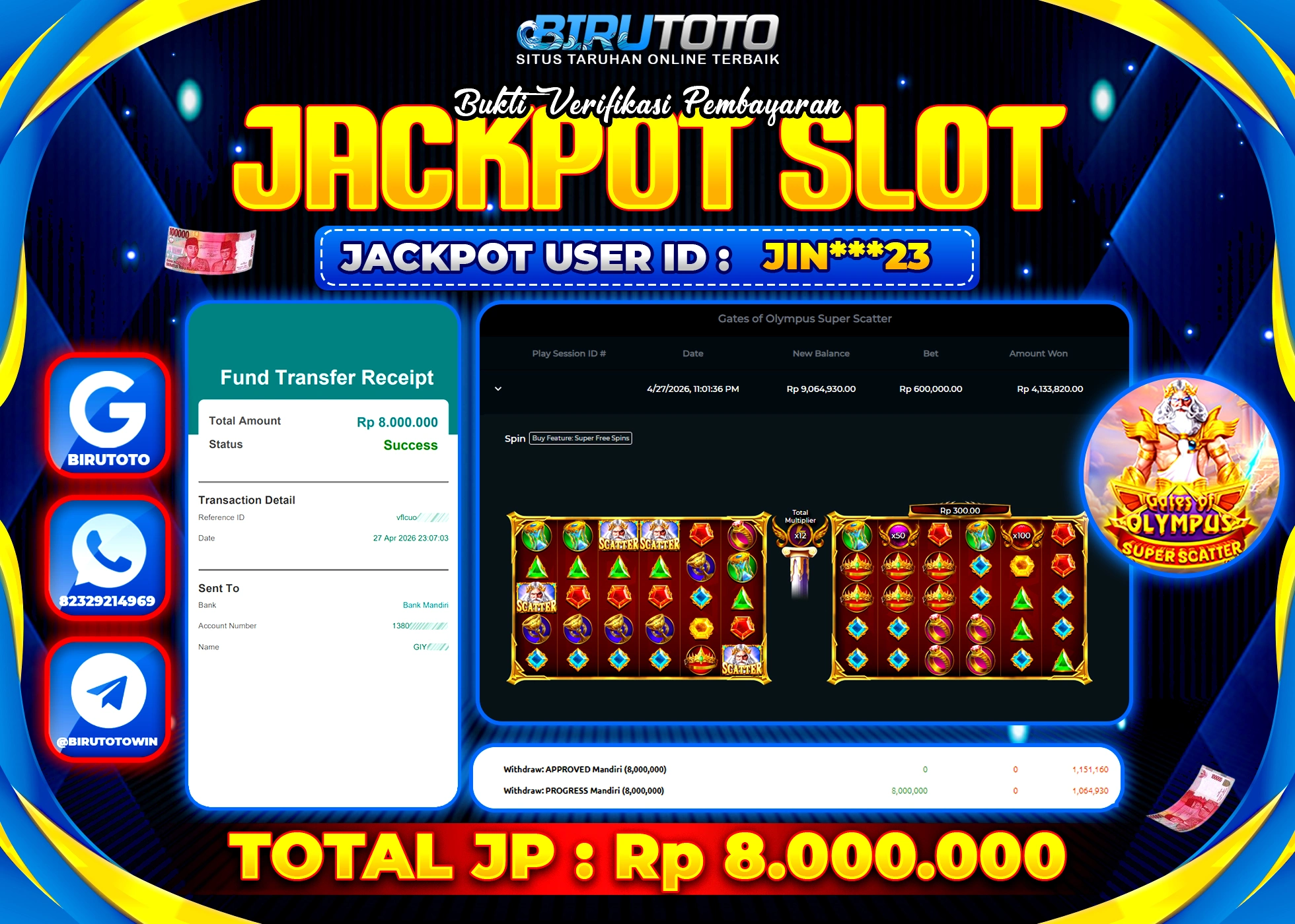 Selamat Kepada Member BIRUTOTO JIN***23 Telah Jackpot Di SLOT GATES OF OLYMPUS SUPER SCATTER