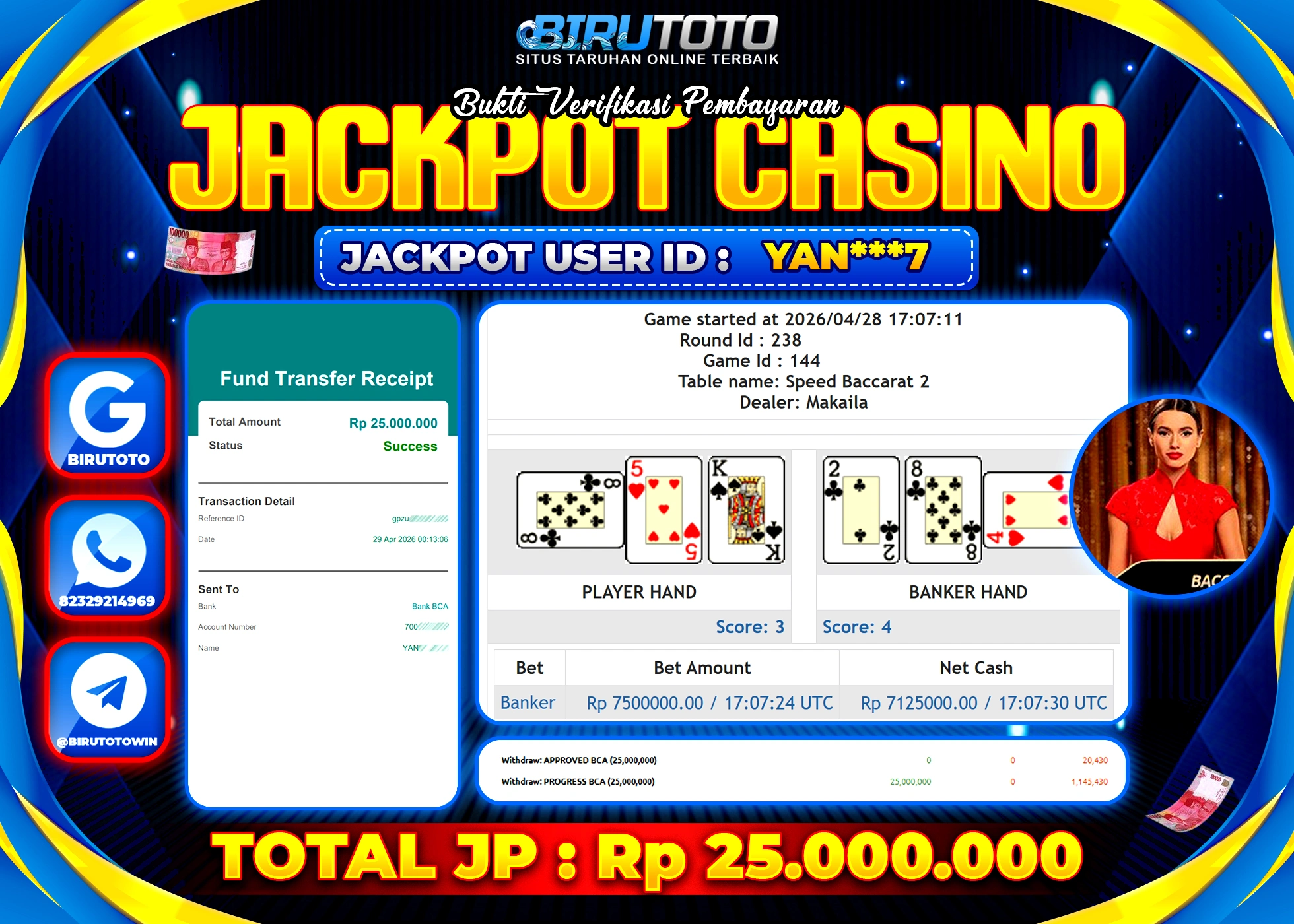 Selamat Kepada Member BIRUTOTO YAN***7 Telah Jackpot Di LIVE CASINO BACCARAT