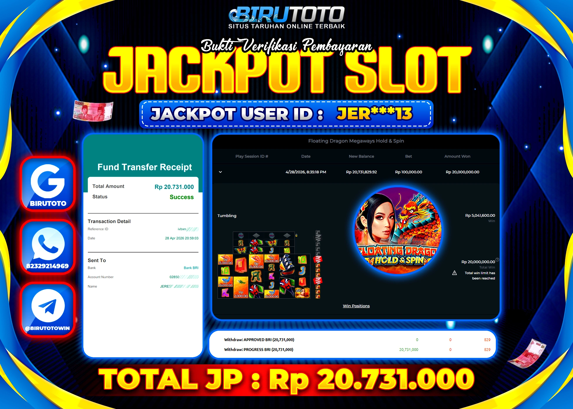 BIRUTOTO JACKPOT SLOT FLOATING DRAGON HOLD & SPIN Rp.20.731.000 LUNAS