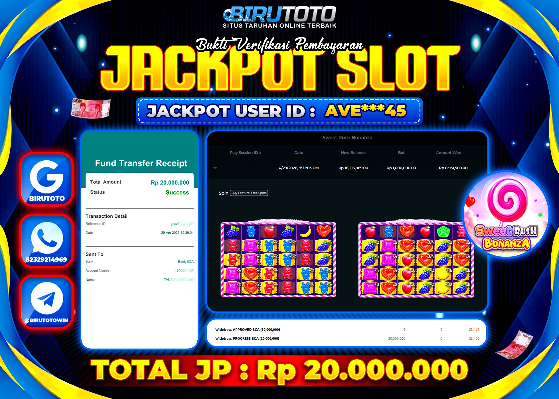 BIRUTOTO JACKPOT SLOT SWEET RUSH BONANZA Rp.20.000.000 LUNAS